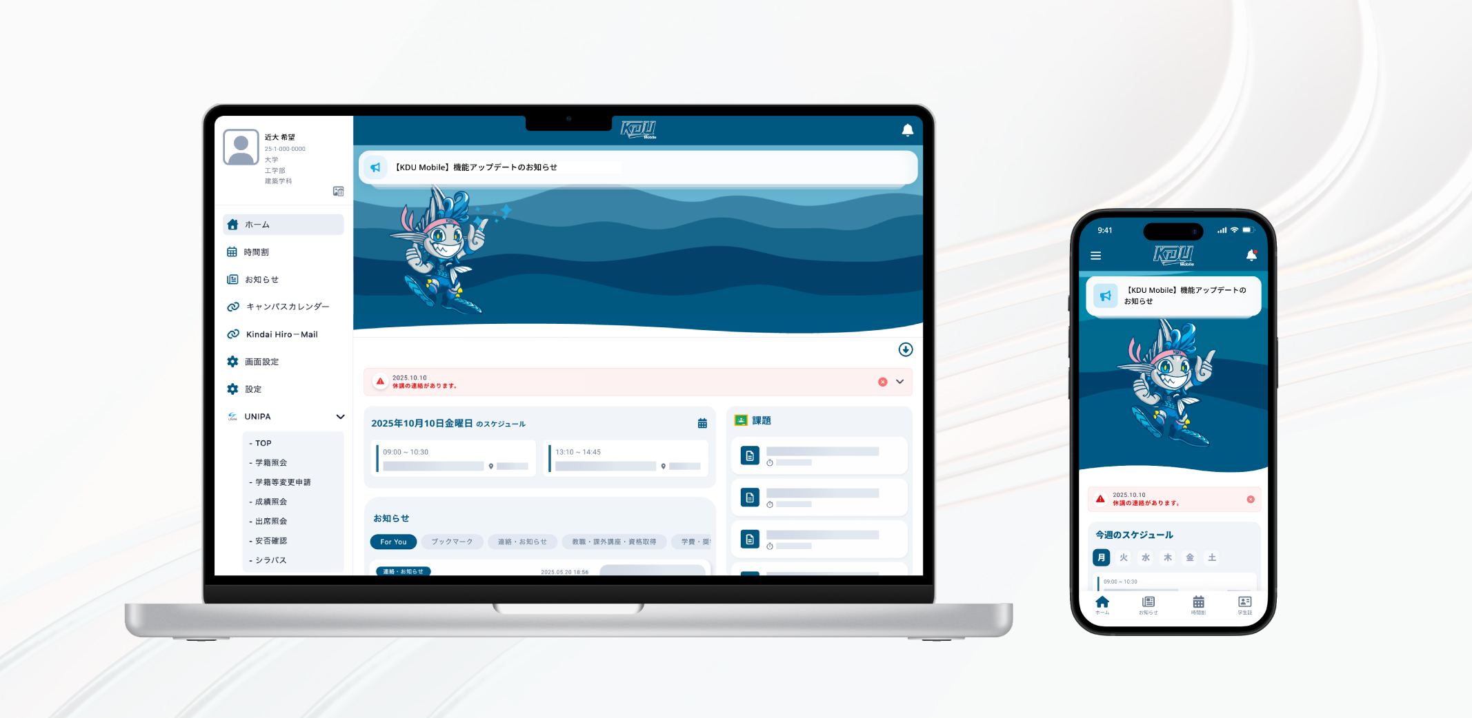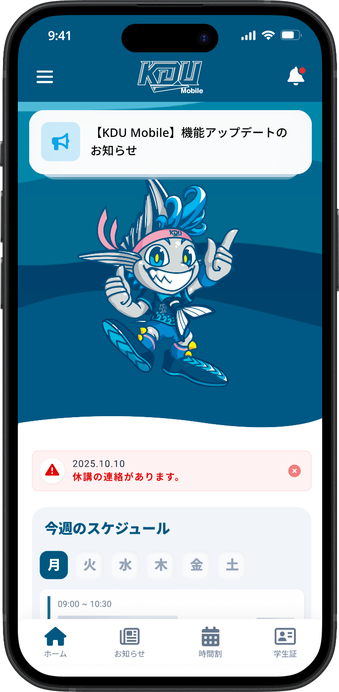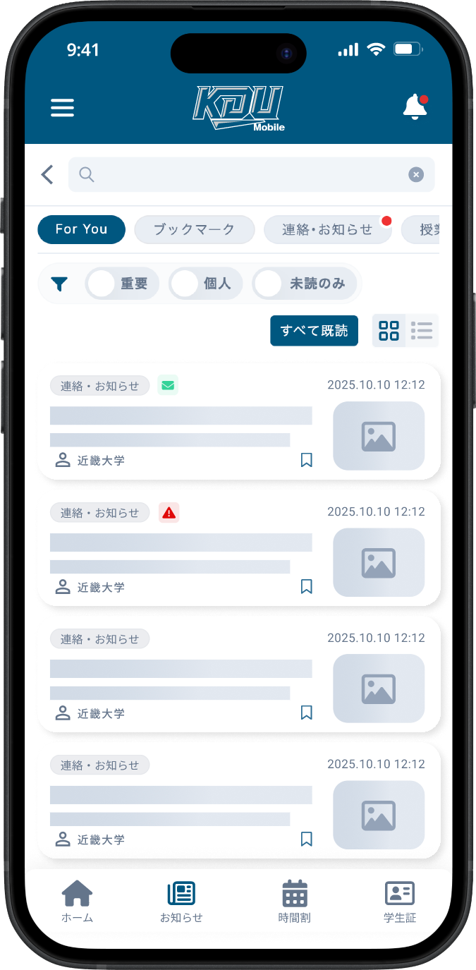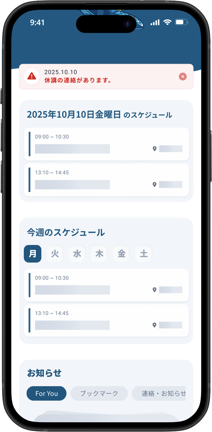 大学からの重要なお知らせは重要なお知らせエリアに表示されます。